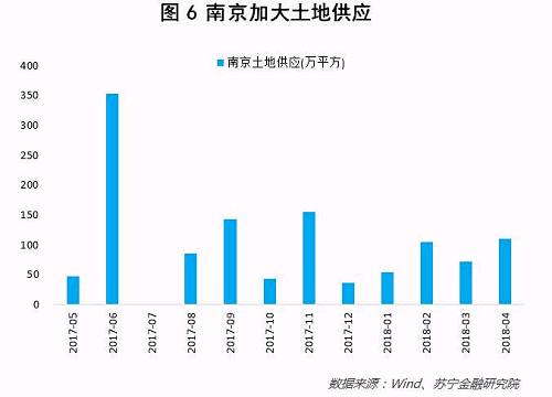 背后的原因是南京加大了土地的供应。2017年5月至2018年4月,南京一共推出了规划建筑面积达1200万平米的住宅用地,而过去6个月南京的月平均住宅销售面积为60万平米左右,这意味着过去一年南京推出的土地可以满足20个月左右的市场需求(参见图6)。这一水平还是较为充足的,很难引发涨价预期。