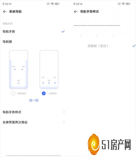 当然我们也可以设置【上下滑动】的导航手势样式,选择图标样式为空白。通过设置,你会发现屏幕上没有虚拟按钮。提示:如果我们设置为向后滑,唤起1/5侧滑的手势是没有用的。