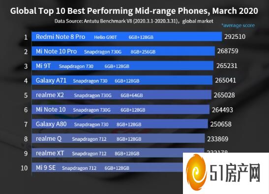 继续,第二第三的位置是小米Mi Note 10 Pr o和小米Mi 9T。前者由更强大的骁龙730G SoC支持,后者由骁龙730g SOC支持。在内存方面,小米Mi Note 10 Pro也有增强的配置,包括8GB RAM和256GB板载存储空间,这无疑为其更高的性能得分做出了贡献。