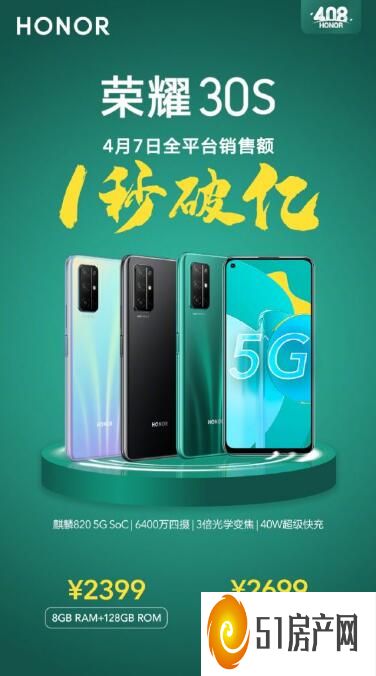 荣耀30s最新销量(公司确认荣耀30S首销1秒突破1亿)