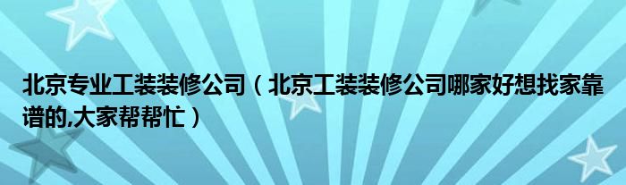 导读 大家好,精选小编来为大家解答以上的问题。北京专业工装装修公司,北京工装装修公司哪家好想找家靠谱的,大家帮帮忙很多人还不知道,现在让