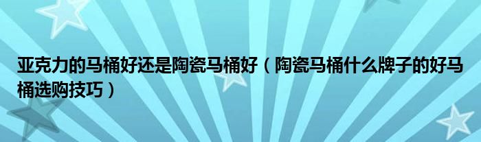 导读 大家好,精选小编来为大家解答以上的问题。亚克力的马桶好还是陶瓷马桶好,陶瓷马桶什么牌子的好马桶选购技巧很多人还不知道,现在让我们一