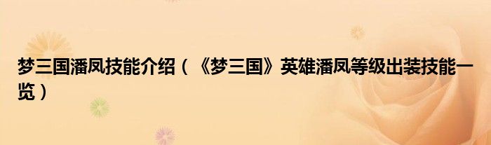 导读 大家好,太太来为大家解答以上问题。梦三国潘凤技能介绍,《梦三国》英雄潘凤等级出装技能一览很多人还不知道,现在让我们一起来看看吧!1