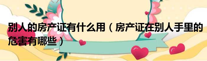 导读 大家好,啊来为大家解答以上的问题。别人的房产证有什么用,房产证在别人手里的危害有哪些这个很多人还不知道,现在让我们一起来看看吧!房