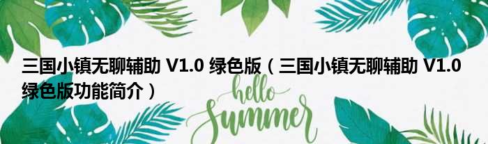 导读 大家好,关于三国小镇无聊辅助 V1 0 绿色版,三国小镇无聊辅助 V1 0 绿色版功能简介这个很多人还不知道,小勒来为大家解答以上的问题,现