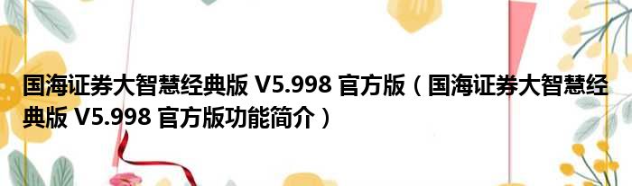 导读 大家好,关于国海证券大智慧经典版 V5 998 官方版,国海证券大智慧经典版 V5 998 官方版功能简介这个很多人还不知道,小勒来为大家解答以