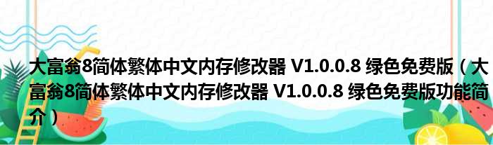 导读 大家好,关于大富翁8简体繁体中文内存修改器 V1 0 0 8 绿色免费版,大富翁8简体繁体中文内存修改器 V1 0 0 8 绿色免费版功能简介这个很