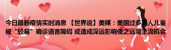 您的位置:首页 >动态频道 > 聚焦疫情 > 今日最新疫情实时消息 【世界说】美媒:美国过多黑人儿童被“轻易”确诊语言障碍 或造成深远影响使之远离主流机会 2022-10-10 06:08:06 • 来源: 导读 免责声明:本文由用户上传,如有侵权请联系删除! 上一篇:今日最新疫情实时消息 上海社会面新增2例新冠肺炎本土确诊病例,涉及长宁区、闵行区 下一篇:今日最新疫情实时消息 美国累计新冠肺炎确诊病例超9669万例