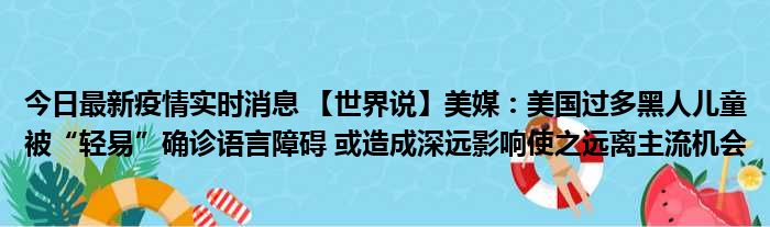 您的位置:首页 >动态频道 > 聚焦疫情 > 今日最新疫情实时消息 【世界说】美媒:美国过多黑人儿童被“轻易”确诊语言障碍 或造成深远影响使之远离主流机会 2022-10-10 06:18:08 • 来源: 导读 免责声明:本文由用户上传,如有侵权请联系删除! 上一篇:今日最新疫情实时消息 上海社会面新增2例新冠肺炎本土确诊病例,涉及长宁区、闵行区 下一篇:今日最新疫情实时消息 美国累计新冠肺炎确诊病例超9669万例