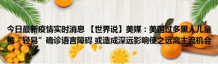您的位置:首页 >动态频道 > 聚焦疫情 > 今日最新疫情实时消息 【世界说】美媒:美国过多黑人儿童被“轻易”确诊语言障碍 或造成深远影响使之远离主流机会 2022-10-10 06:28:07 • 来源: 导读 免责声明:本文由用户上传,如有侵权请联系删除! 上一篇:今日最新疫情实时消息 上海社会面新增2例新冠肺炎本土确诊病例,涉及长宁区、闵行区 下一篇:今日最新疫情实时消息 美国累计新冠肺炎确诊病例超9669万例