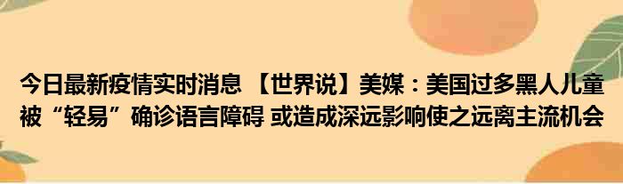 您的位置:首页 >动态频道 > 聚焦疫情 > 今日最新疫情实时消息 【世界说】美媒:美国过多黑人儿童被“轻易”确诊语言障碍 或造成深远影响使之远离主流机会 2022-10-10 06:52:06 • 来源: 导读 免责声明:本文由用户上传,如有侵权请联系删除! 上一篇:今日最新疫情实时消息 上海社会面新增2例新冠肺炎本土确诊病例,涉及长宁区、闵行区 下一篇:今日最新疫情实时消息 北京通州新增1例确诊病例,主要风险点位公布,已划定中、低风险区