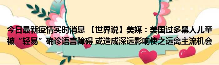 您的位置:首页 >动态频道 > 聚焦疫情 > 今日最新疫情实时消息 【世界说】美媒:美国过多黑人儿童被“轻易”确诊语言障碍 或造成深远影响使之远离主流机会 2022-10-10 08:02:07 • 来源: 导读 免责声明:本文由用户上传,如有侵权请联系删除! 上一篇:今日最新疫情实时消息 上海社会面新增2例新冠肺炎本土确诊病例,涉及长宁区、闵行区 下一篇:今日最新疫情实时消息 北京通州新增1例确诊病例,主要风险点位公布,已划定中、低风险区