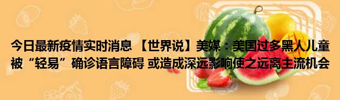 您的位置:首页 >动态频道 > 聚焦疫情 > 今日最新疫情实时消息 【世界说】美媒:美国过多黑人儿童被“轻易”确诊语言障碍 或造成深远影响使之远离主流机会 2022-10-10 09:54:06 • 来源: 导读 免责声明:本文由用户上传,如有侵权请联系删除! 上一篇:今日最新疫情实时消息 上海社会面新增2例新冠肺炎本土确诊病例,涉及长宁区、闵行区 下一篇:今日最新疫情实时消息 北京通州新增1例确诊病例,主要风险点位公布,已划定中、低风险区
