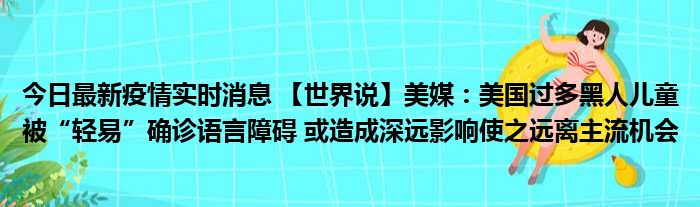 您的位置:首页 >动态频道 > 聚焦疫情 > 今日最新疫情实时消息 【世界说】美媒:美国过多黑人儿童被“轻易”确诊语言障碍 或造成深远影响使之远离主流机会 2022-10-10 11:14:08 • 来源: 导读 免责声明:本文由用户上传,如有侵权请联系删除! 上一篇:今日最新疫情实时消息 上海社会面新增2例新冠肺炎本土确诊病例,涉及长宁区、闵行区 下一篇:今日最新疫情实时消息 北京通州新增1例确诊病例,主要风险点位公布,已划定中、低风险区