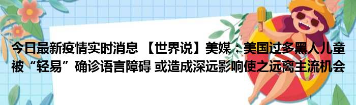 您的位置:首页 >动态频道 > 聚焦疫情 > 今日最新疫情实时消息 【世界说】美媒:美国过多黑人儿童被“轻易”确诊语言障碍 或造成深远影响使之远离主流机会 2022-10-10 12:52:07 • 来源: 导读 免责声明:本文由用户上传,如有侵权请联系删除! 上一篇:今日最新疫情实时消息 宁夏昨日新增本土确诊病例4例、本土无症状感染者49例 下一篇:今日最新疫情实时消息 山西10月9日新增本土新冠确诊病例25例