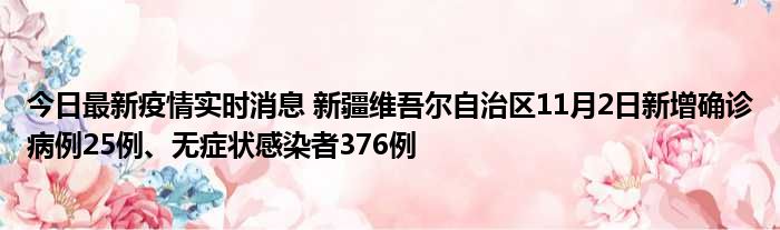 新疆卫健委通报,11月2日0时至24时,新疆维吾尔自治区新增确诊病例25例,新增无症状感染者376例,新增确诊病例治愈出院7例,新增无症状感