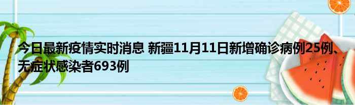 据新疆卫健委,11月11日0时至24时,新疆维吾尔自治区新增确诊病例25例,新增无症状感染者693例,新增确诊病例治愈出院7例,新增无症状感染者解除隔离医学观察120例
