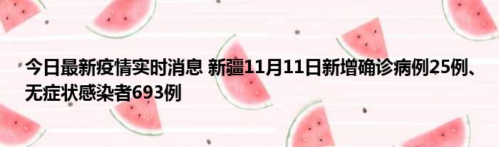 据新疆卫健委,11月11日0时至24时,新疆维吾尔自治区新增确诊病例25例,新增无症状感染者693例,新增确诊病例治愈出院7例,新增无症状感染者解除隔离医学观察120例