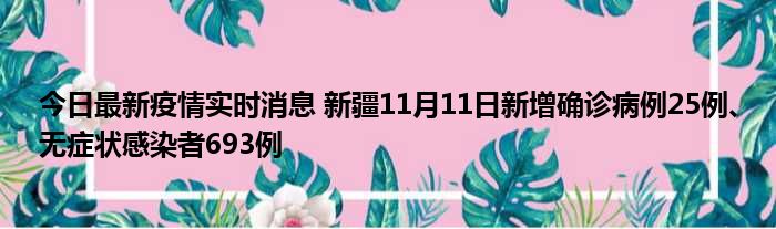据新疆卫健委,11月11日0时至24时,新疆维吾尔自治区新增确诊病例25例,新增无症状感染者693例,新增确诊病例治愈出院7例,新增无症状感染者解除隔离医学观察120例