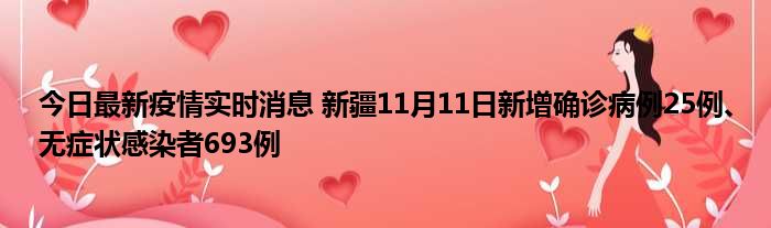 据新疆卫健委,11月11日0时至24时,新疆维吾尔自治区新增确诊病例25例,新增无症状感染者693例,新增确诊病例治愈出院7例,新增无症状感染者解除隔离医学观察120例