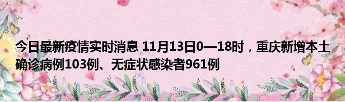 11月13日0—18时,重庆市新增本土确诊病例103例(秀山县24例,沙坪坝区17例,开州区、垫江县各10例,渝中区7例,奉节县6例,云阳县5例,江北区、梁平区各4例,渝北区、巴南区各3例,涪陵区、长寿区、綦江区各2例,九龙坡区、璧山区、忠县、石柱县各1例);新增无症状感染者961例(九龙坡区271例,渝北区196例,沙坪坝区106例,垫江县59例,南岸区50例,合川区46例,巴南区42例,巫溪县35例,江北区30例,大渡口区27例,北碚区15例,秀山县12例,江津区11例,渝中区10例,璧山区8例,綦江区7例,铜梁区5例,万州区、涪陵区、开州区、云阳县各4例,长寿区、城口县、奉节县、巫山县各2例,永川区、南川区、大足区、梁平区、丰都县、酉阳县、彭水县各1例)