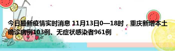 11月13日0—18时,重庆市新增本土确诊病例103例(秀山县24例,沙坪坝区17例,开州区、垫江县各10例,渝中区7例,奉节县6例,云阳县5例,江北区、梁平区各4例,渝北区、巴南区各3例,涪陵区、长寿区、綦江区各2例,九龙坡区、璧山区、忠县、石柱县各1例);新增无症状感染者961例(九龙坡区271例,渝北区196例,沙坪坝区106例,垫江县59例,南岸区50例,合川区46例,巴南区42例,巫溪县35例,江北区30例,大渡口区27例,北碚区15例,秀山县12例,江津区11例,渝中区10例,璧山区8例,綦江区7例,铜梁区5例,万州区、涪陵区、开州区、云阳县各4例,长寿区、城口县、奉节县、巫山县各2例,永川区、南川区、大足区、梁平区、丰都县、酉阳县、彭水县各1例)