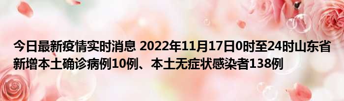 您的位置:首页 >动态频道 > 聚焦疫情 > 今日最新疫情实时消息 2022年11月17日0时至24时山东省新增本土确诊病例10例、本土无症状感染者138例 2022-12-08 18:42:21 • 来源: 导读 免责声明:本文由用户上传,如有侵权请联系删除! 上一篇:今日最新疫情实时消息 陕西11月17日新增74例本土确诊病例、584例本土无症状感染者 下一篇:今日最新疫情实时消息 广西11月17日新增本土确诊病例1例、本土无症状感染者55例