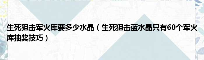 大家好,今天小六子来为大家解答以下的问题,关于生死狙击军火库要多少水晶,生死狙击蓝水晶只有60个军火库抽奖技巧这个很多人还不知道,现在让我们一起来看看吧!
